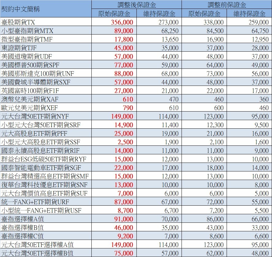 臺灣期貨交易所於114年4月15日公告調整臺股期貨契約(TX)、小型臺指期貨契約(MTX)、客製化小型臺指期貨契約(MXFFX)、微型臺指期貨契約(TMF)、東證期貨契約(TJF)、美國道瓊期貨契約(UDF)、美國標普500期貨契約(SPF)、美國那斯達克100期貨契約(UNF)、美國費城半導體期貨契約(SXF)、英國富時100期貨契約(F1F)、澳幣兌美元期貨契約(XAF)、歐元兌美元期貨契約(XEF)、元大台灣50ETF期貨契約(NYF)、小型元大台灣50ETF期貨契約(SRF)、元大高股息ETF期貨契約(PFF)、小型元大高股息ETF期貨契約(SSF)、國泰永續高股息ETF期貨契約(RIF)、群益台ESG低碳50ETF期貨契約(RYF)、國泰智能電動車ETF期貨契約(SGF)、群益台灣精選高息ETF期貨契約(SMF)、復華台灣科技優息ETF期貨契約(SNF)、元大台灣價值高息ETF期貨契約(SUF)、統一FANG+ETF期貨契約(URF)、小型統一FANG+ETF期貨契約(USF)、臺指選擇權契約(TXO)及元大台灣50ETF選擇權契約(NYO)之期貨契約保證金及選擇權契約風險保證金(A值)、風險保證金最低值(B值)、混合部位風險保證金(C值)所有月份保證金金額,並自114年4月16日一般交易時段結束後起實施。