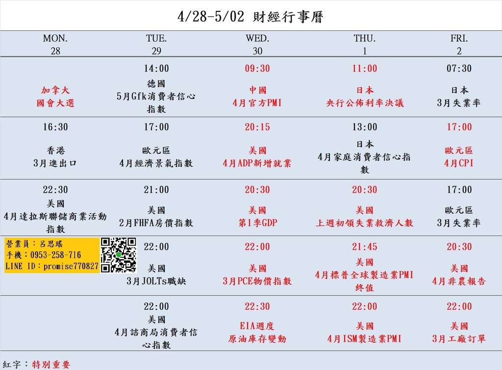 以下是2025年04月28日至05月02日的市場重要經濟數據公布時間
