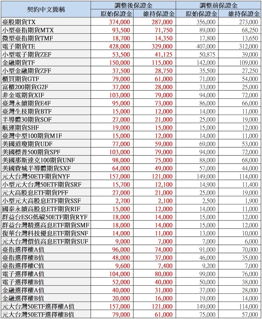 期交所稍早公告調整臺股期貨契約(TX)等19檔國內股價指數類契約、美國道瓊期貨契約(UDF)等4檔國外股價指數類契約及元大台灣50ETF期貨契約(NYF)等10檔標的證券為受益憑證之股票類契約之期貨契約保證金及選擇權契約風險保證金(A值)、風險保證金最低值(B值)、混合部位風險保證金(C值)所有月份保證金金額,並自114年5月21日一般交易時段結束後起實施,請查照。